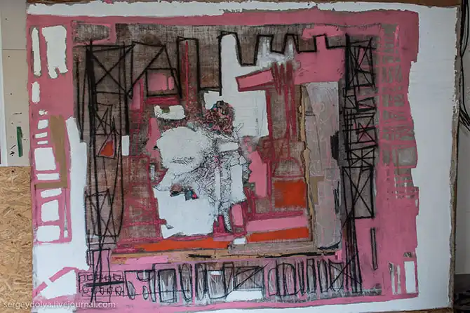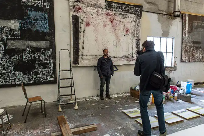 Художник работает следующим образом: берет простынь, мажет гипсом и краской и приклеивает на бетонный пол. Когда ткань высыхает, он открывает ее от пола и использует как основу для своих полотен: