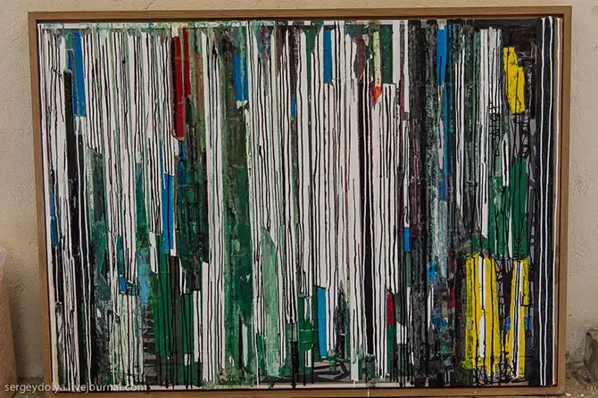 Мне понравились эти картины. На фото они выглядят не так впечатляюще, но вживую, если присмотреться, они состоят из наклеенных бумажек, досок, опилок… Настоящий слоеный пирог: