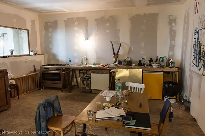 Мы приехали к Жульену в мастерскую. Настоящая творческая и холостяцкая берлога: картины, ударная установка, колонки и телевизор: