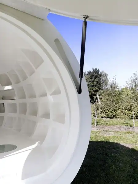 Специалисты из бельгийской архитекторской конторы dmvA потратили полтора года на разработку этого мобильного дома, получившего название "Капля". Внутри есть душевая, кухня и кровать, а также масса полочек для того, чтобы разложить на них свои пожитки. Жилая площадь - 20 квадратных метров. Обзавестись "Каплей" может любой желающий, но цена оглашается только после заявки.