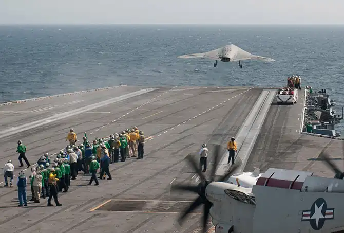 Демонстрационная модель беспилотного боевого летательного аппарата X-47B взлетает с борта авианосца «Джордж Буш».