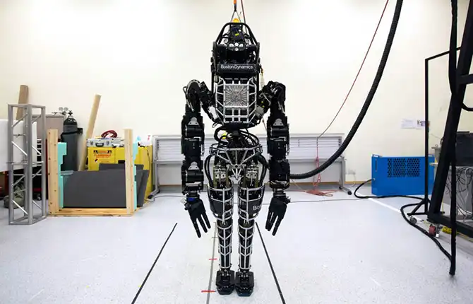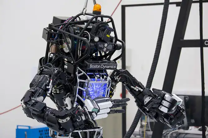 Гуманоидный робот «Atlas», разработанный американской инженерной компанией Boston Dynamics, во время пресс-показа в Гонконгском университете, 17 октября 2013 года. Робот высотой 1,83 метра и весом 149,7 килограмм, сделанный из высокосортного алюминия и титана, стоит 15 миллионов гонконгских долларов (1,93 миллиона долларов США). Робот способен выполнять ряд различных движений, таких как ходьба и гимнастика.