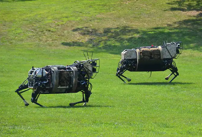 Роботы LS3, разработанные Агентством по перспективным оборонным научно-исследовательским разработкам США (DARPA), бегут по полю во время тестирования. Роботы LS3 созданы для транспортировки грузов по пересеченной местности.