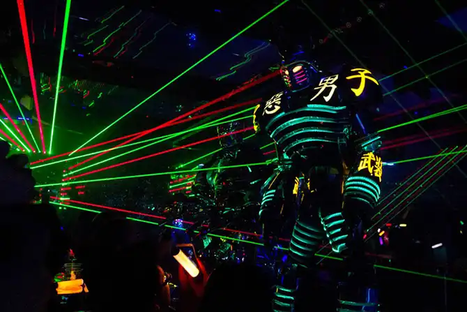 Лазерные огни освещают робота, который является частью интерьера ресторана Robot Restaurant в Токио, Япония, 6 октября 2013 года.