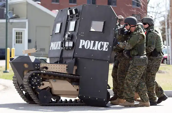 Робот SWAT, небольшое, похожее на танк дистанционно управляемое транспортное средство, разработанное компанией Howe & Howe Technologies, во время пресс-показа в Санфорде, штат Мэн, 18 апреля 2013 года. Робот может служить щитом для бойцов подразделения SWAT и сотрудников экстренных служб во время противостояний с вооруженными преступниками.