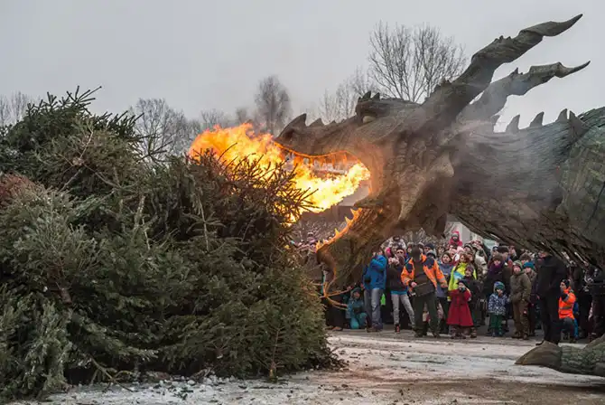 Роботизированный дракон из средневекового спектакля «The Dragon’s Sting» сжигает рождественские ёлки в городе Фурт-им-Вальд, Германия, 24 января 2013 года.