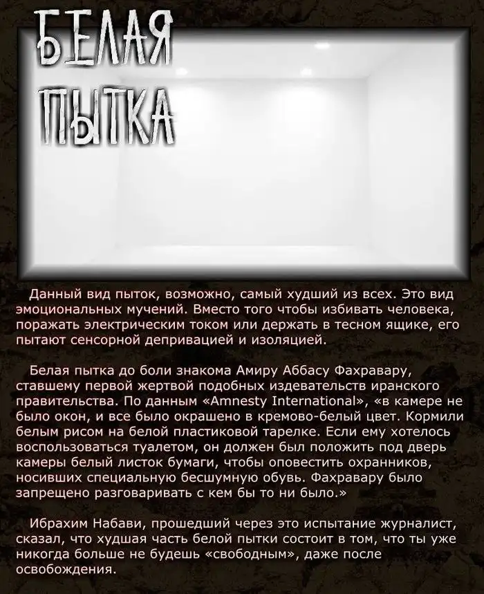 Макание в воду, противогаз и старый добрый резиновый шланг здесь не упомянуты, видимо, потому что теперь вообще пытками не считаются...