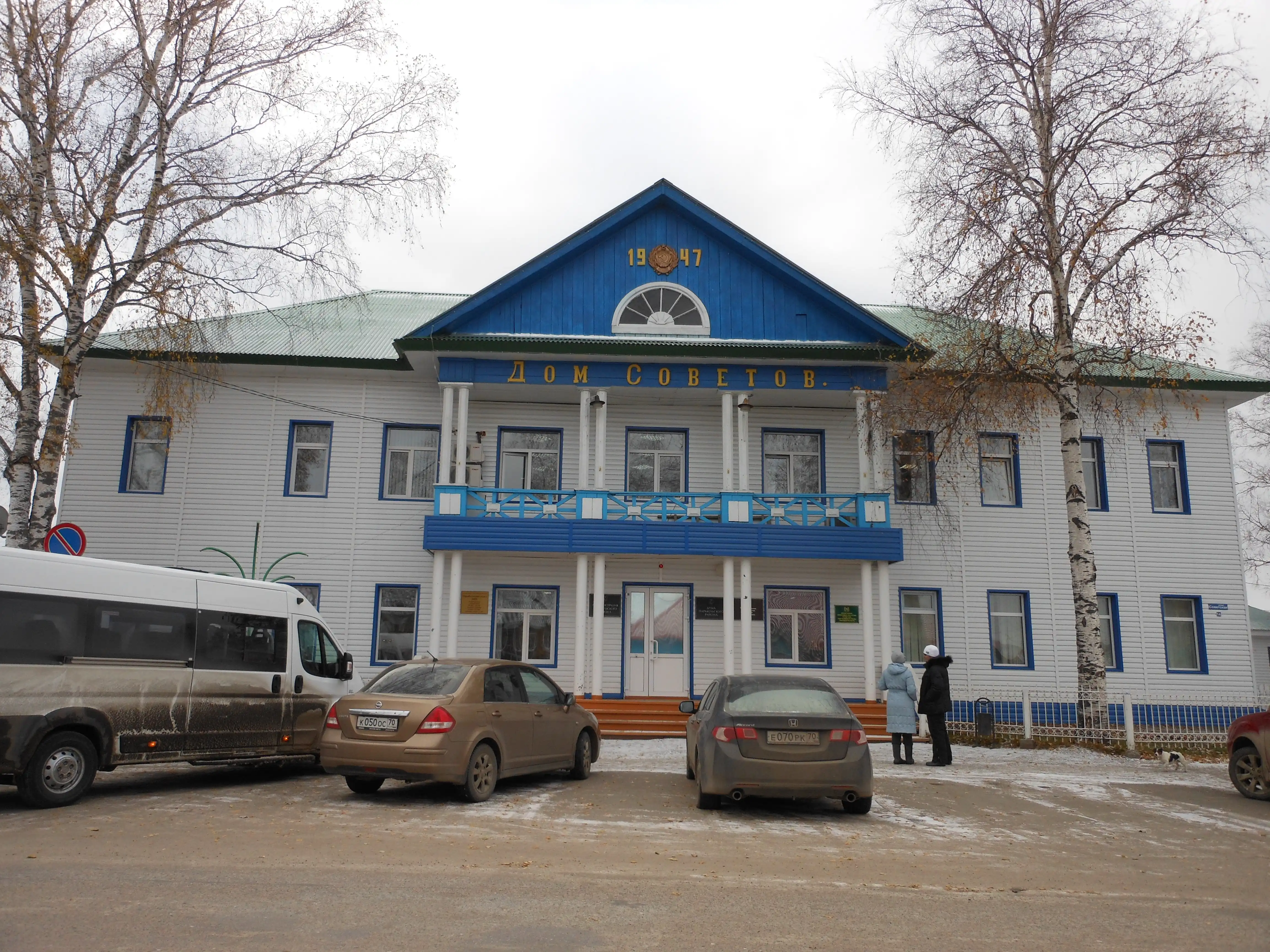 В самой Парабели остановились лишь раз у здания местной администрации, которое явно сохранилось еще с советских времен. На нем гордо красуется вывеска "Дом советов".