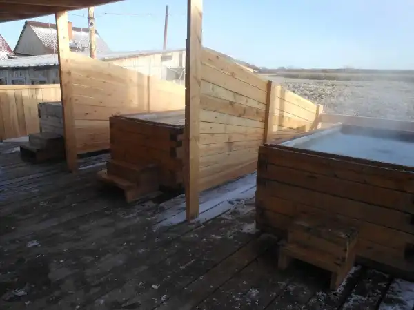 И вот мы на месте. База отдыха "Горячий источник". Несколько деревянных домиков, баня, хозяйственные постройки и, конечно же, "гвоздь программы" - горячие ванны с термальной водой.