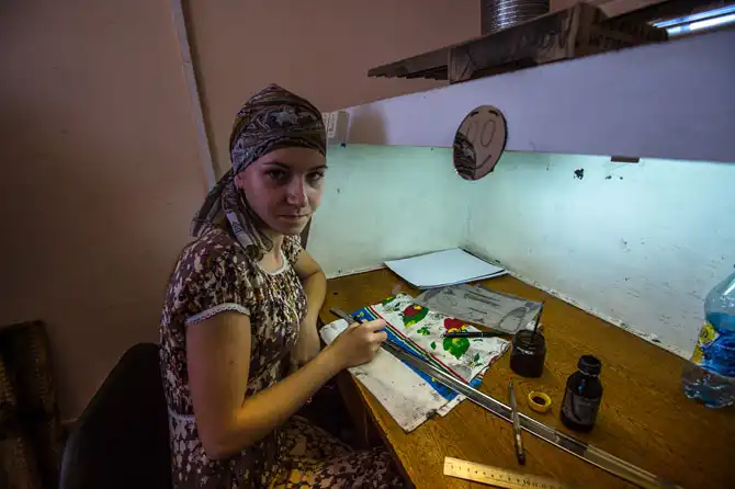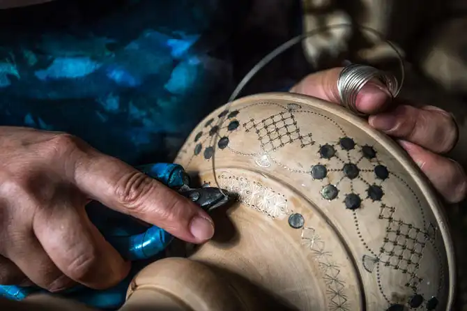 Теперь и женщина участвует в такого вида работе. Орнаменты на лезвиях.