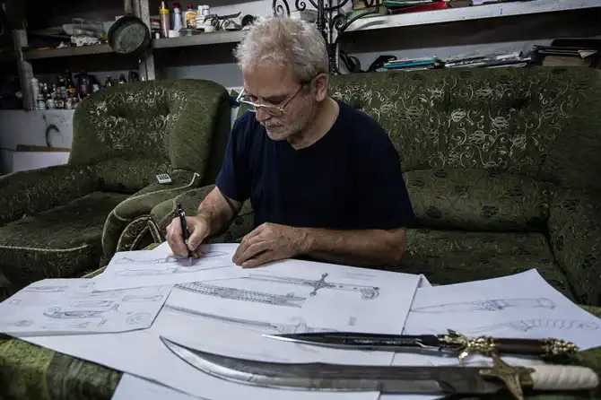 Перед тем как делать очередной меч или саблю, сперва рисуются эскизы, прорабатывается форма и узоры, вплоть до миллиметра. Только потом начинается работа с металлом.