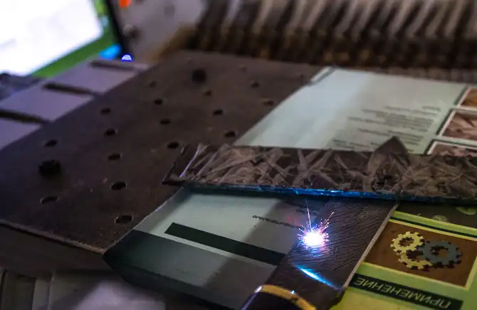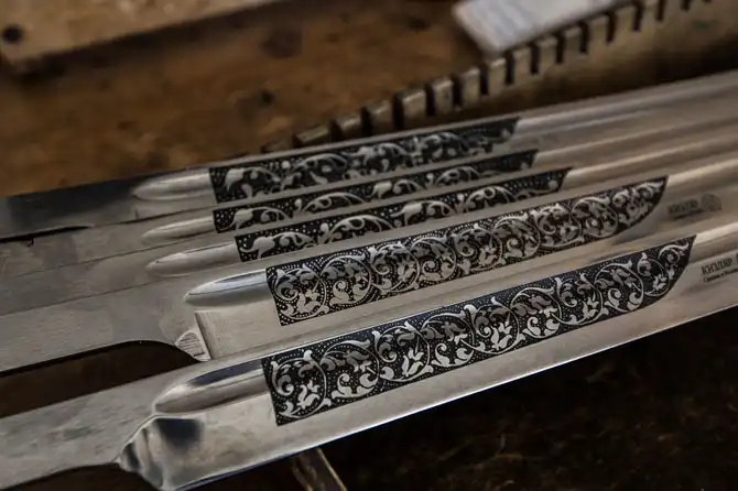 На готовых ножах пишут лазером название изделия, логотип и, может быть, какой-то рисунок, который заложен программой.
