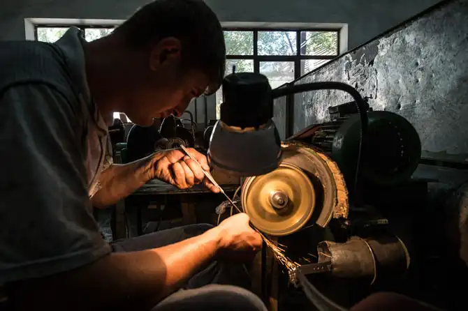 Будучи в Дагестане, мы заглянули проездом в город Кизляр. На полчаса нас пустили посмотреть производство ножей в современные цеха. Вот так работает современный завод практически без ручного труда, одна штамповка. Правда, у Кизляра есть отдельные модели, штучные, или как говорят, дизайнерские, к которым приложено немало человеческих усилий и таланта. Но это опять же, штучный товар. Как ни крути…