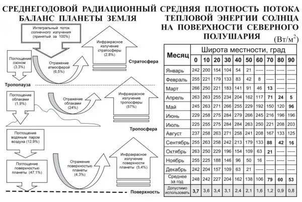 Примерно 40% солнечной энергии, падающей на Землю из космоса, в процессе обратного переизлучения некоторое время существует в нижних слоях атмосферы в виде электрического поля. На схеме показано распределение потока энергии и указаны механизмы её транспортировки. Таблица показывает какую мощность можно в предельном случае снимать из атмосферы в различных широтах.