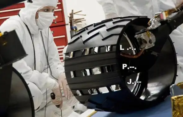 Когда марсоход третьего поколения Curiosity начал свою миссию на Красной планете, NASA открыло небольшой секрет. Оказывается, след от протектора с колес марсохода имеет особенный рисунок. Инженеры космического агентства признались, что дизайн колес марсохода был придуман ими таким образом, чтобы в процессе движения по марсианскому грунту на нем оставались следы в виде определенной последовательности длинных и коротких черточек: «.--- .-- .-». Если эту последовательность расшифровать с помощью азбуки Морзе, смысл послания марсианам становится понятным. J, P и L — это первые буквы названия Лаборатории реактивного движения, научно-исследовательского подразделения NASA, которое занималось разработкой Curiosity.