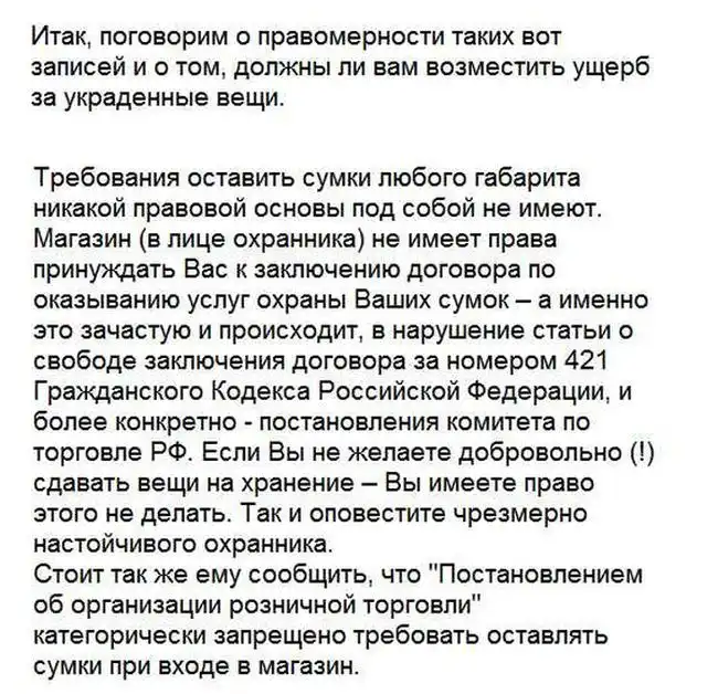 Уже несколько лет периодически натыкаюсь на такие статьи, повышающие правовую грамотность населения. Написано обычно правильно, но как и в этой статье оторвано от реальности. Единственно верно на практике, чему сам следую, это посылать лесом желающих заглянуть ко мне в сумку, особенно на входе. На выходе может выйти конфликт, отнимающий время, лучше просто раскрыть и показать мельком содержимое. Ну и про "не несем ответственность": бывают случаи, когда организации просто заявляют, что камеры хранения не их и доказать обратное не просто.