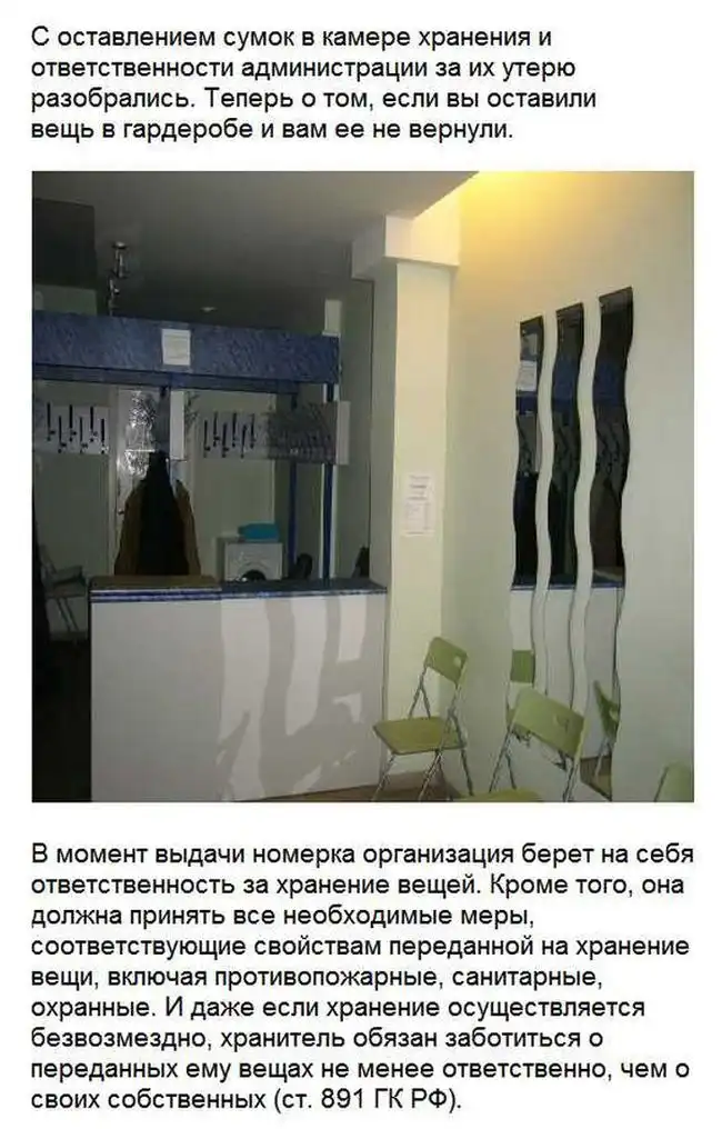 Так может любой дурак положить сумку на хранение а потом сказать, что у него украли миллион зелёных. Хотел бы я посмотреть как очередной читатель данной статьи будет угрожать судом за то, что его не пустили с сумкой