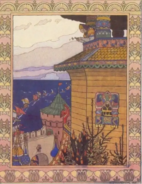 Билибин. Иллюстрация к сказке "Белая уточка". 1902. Б., акв., тушь, золото; Музей Гознака.