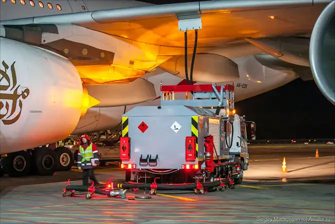 Любому большому воздушному судну всегда хочется кушать. Причем самое лучшее топливо. Не проблема! Доставим топливо прямо на стоянку с помощью централизованной заправочной системы (ЦЗС) и мощного насоса на базе автомобиля.
