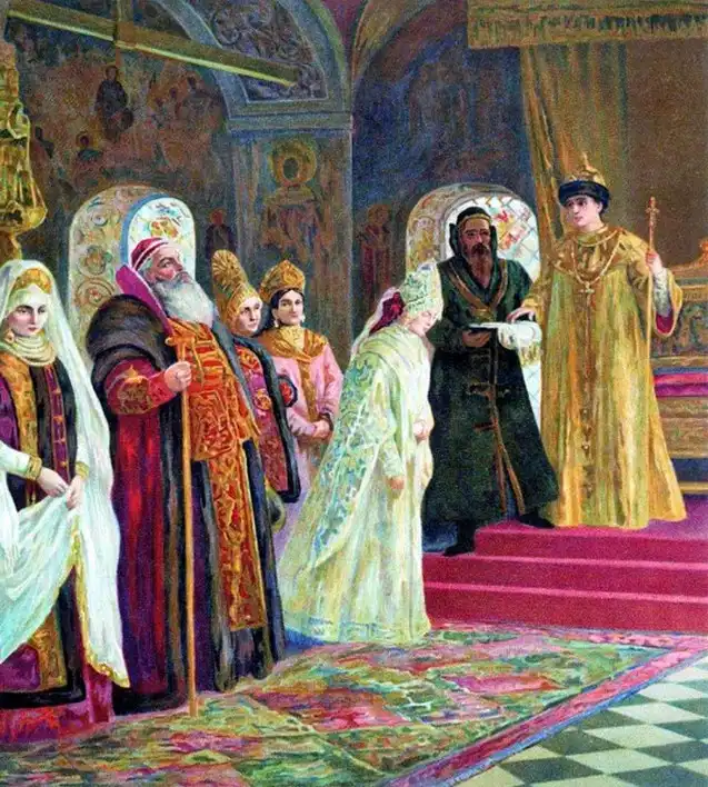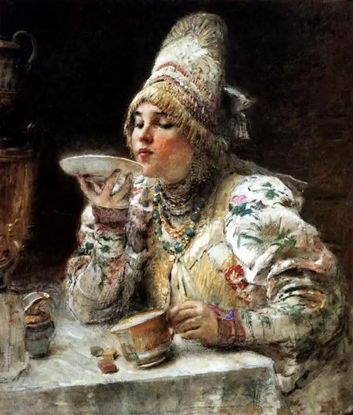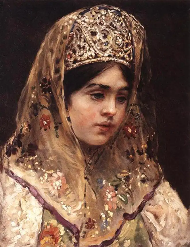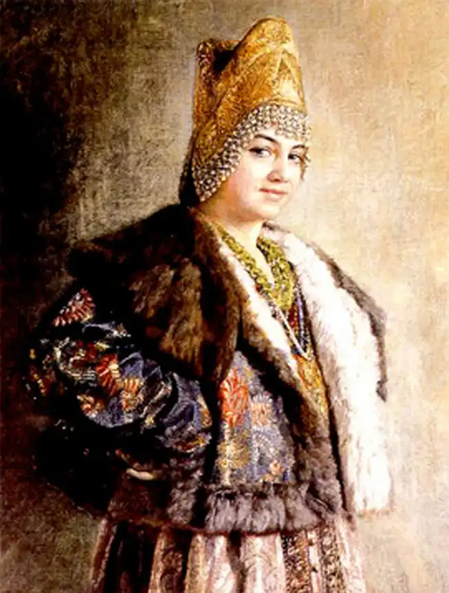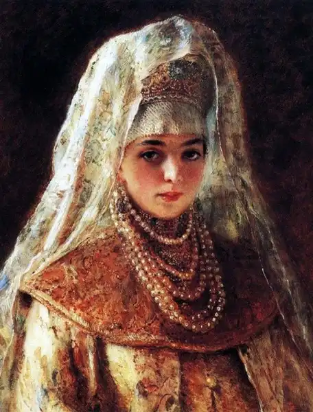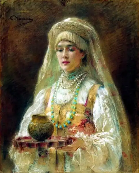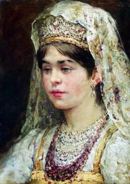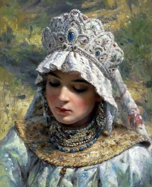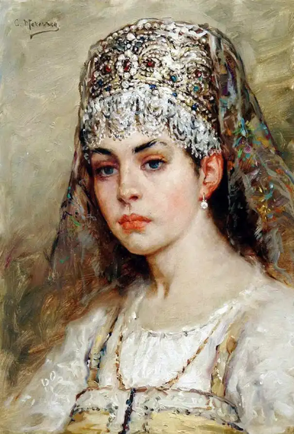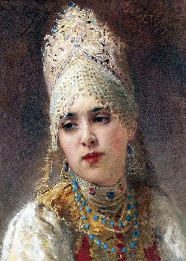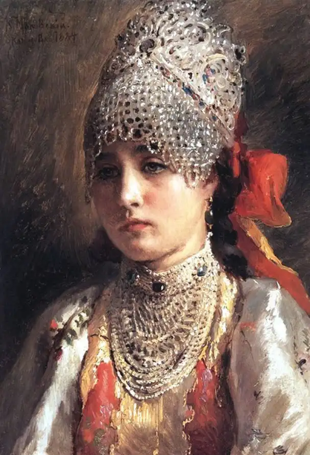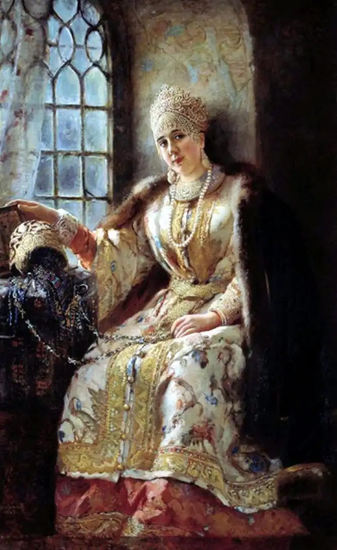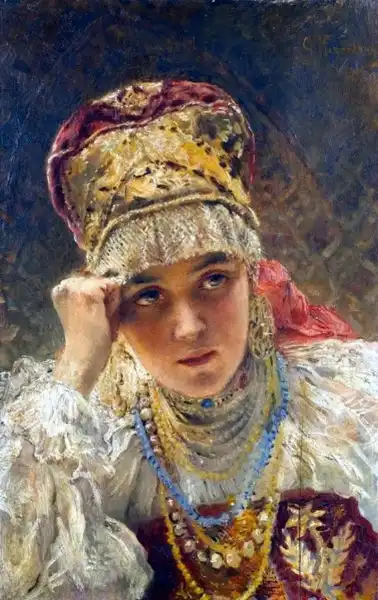 Одним из самых известных и талантливых русских живописцев второй половины 19 века, который воспел в своих полотнах русскую старину, является Константин Егорович Маковский (1839-1915 гг.). Он написал великое множество ярких картин боярской Руси 17 века. Его красавицы "боярышни" наряжены в красочные русские одежды и дивные головные уборы, и украшены роскошными серьгами и ожерельями той далёкой эпохи, которые прорисованы с поразительной детализацией. Его картины настолько точны в воспроизведении обстановки того времени, что способны заменить десятки учебников, и написаны с такой любовью к русской культуре, что воодушевляют не только на любование ими, но и вызывают стремление узнать и полюбить богатейшее наследие наших предков. Не многим известно, что источником этой точности и убедительности является его давнее и страстное увлечение - коллекционирование предметов русской (и не только) старины, которым он занимался всю свою жизнь.