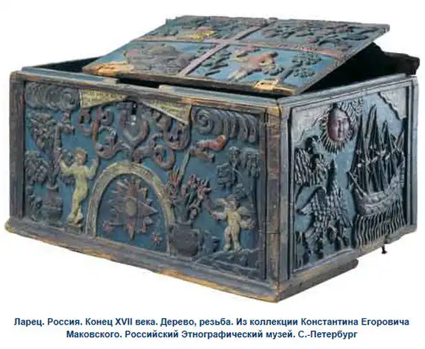 Туалет. Россия, Холмогоры. Конец XVIII века. Дуб, кость мамонта, резьба, раскраска. Из коллекции Константина Егоровича Маковского. Российский Этнографический музей. С.- Петербург.