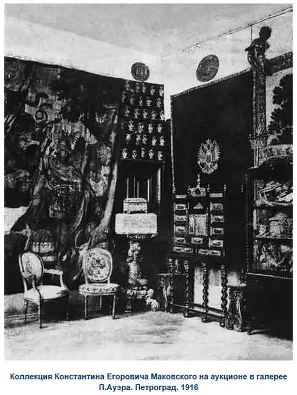 Маковский не без основания гордился своим собранием. Он с удовольствием, как некогда его отец Егор Иванович, показывал свою коллекцию, вещи предоставлял на выставки. Одной из последних была "Выставка церковной старины", устроенная Музеем при Училище технического рисования барона Штиглица весной 1915 года. И вряд ли он мог даже представить, что коллекция, собиравшаяся с любовью в течение более полувека, занимавшая столь важное место в его жизни и искусстве, и сама по себе уже ставшая отражением целой эпохи в русской культуре, совсем скоро будет пущена с публичных торгов.