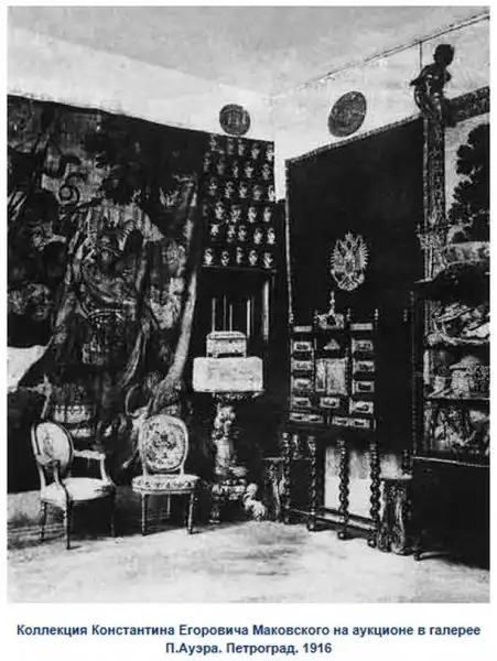 В начале марта 1916 года в Петроградских газетах появились объявления о "богатом" аукционе "имущества, оставшегося после смерти знаменитого художника и коллекционера профессора Императорской академии художеств Константина Георгиевича Маковского". Прошло всего полгода как художника не стало в результате трагического случая. Сбитый уличной пролёткой на одной из улиц Петроградской стороны, он получил тяжёлую травму головы, от которой 17 сентября 1915 года скончался. В каталоге, сопровождавшем аукцион, перечислено 1100 предметов.