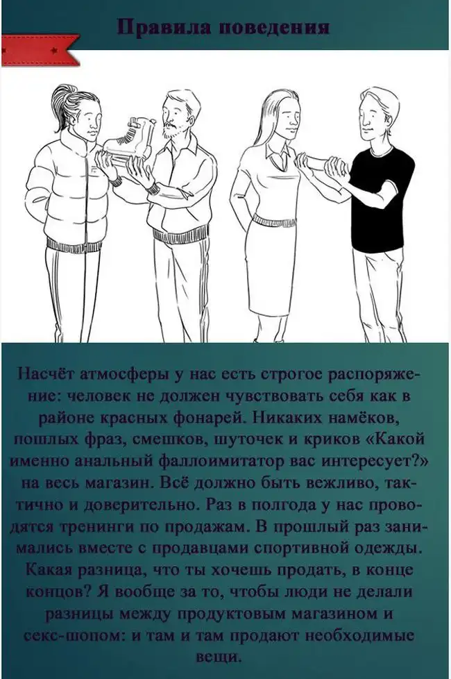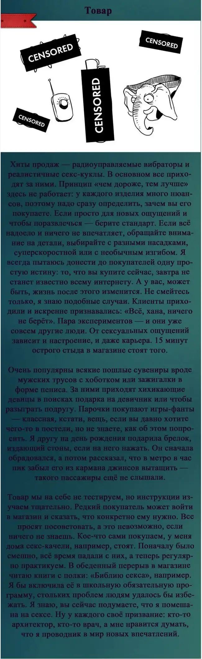Просто человек (в данном случае женщина) описал(а) свои впечатления о работе в магазине интим товаров.