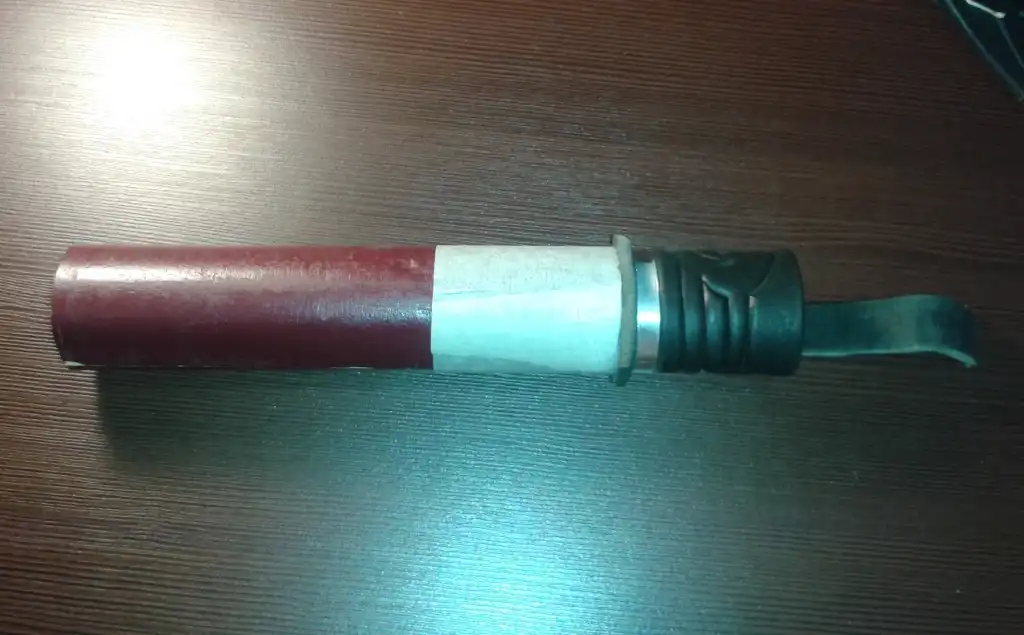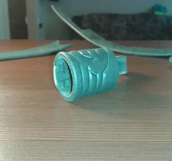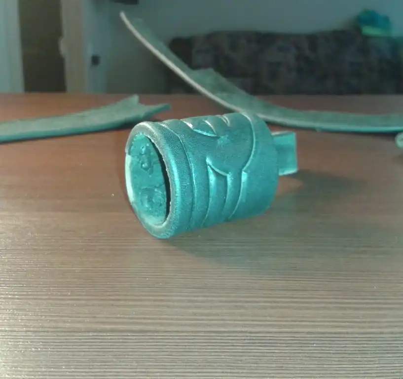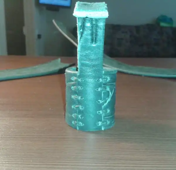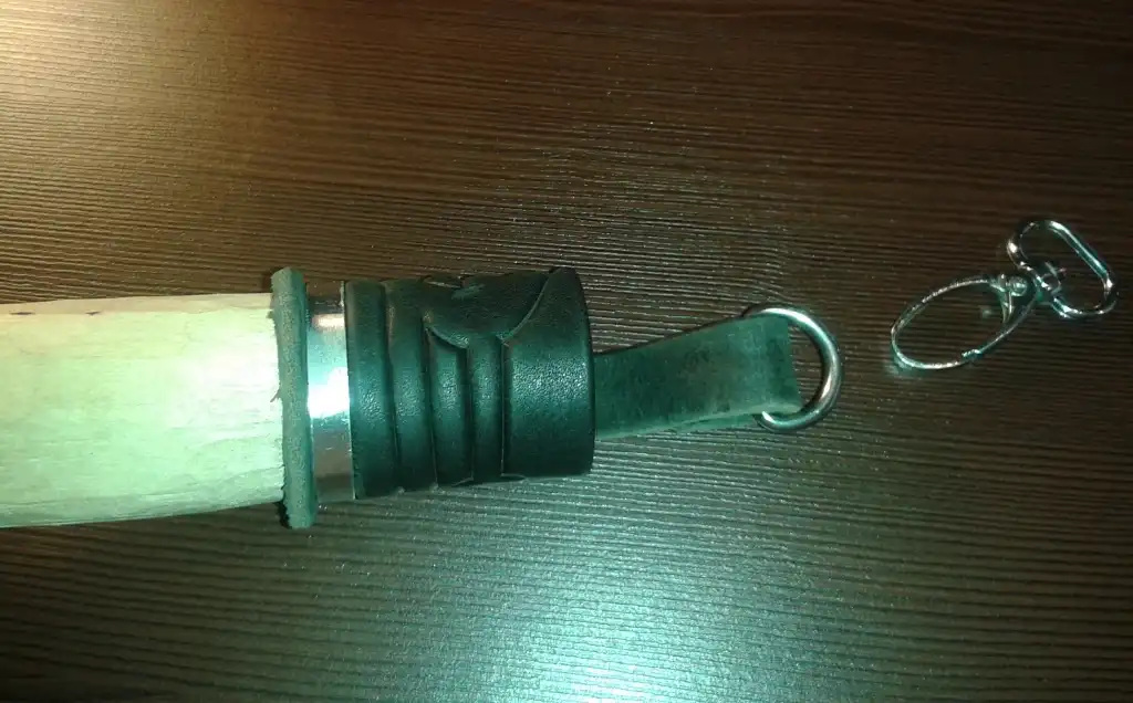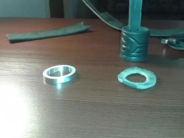 Вот не полный набор верхушки ножен: то что сшил + сплющенное кольцо (держатель шпинделя) от жесткого диска + кожаное кольцо.
