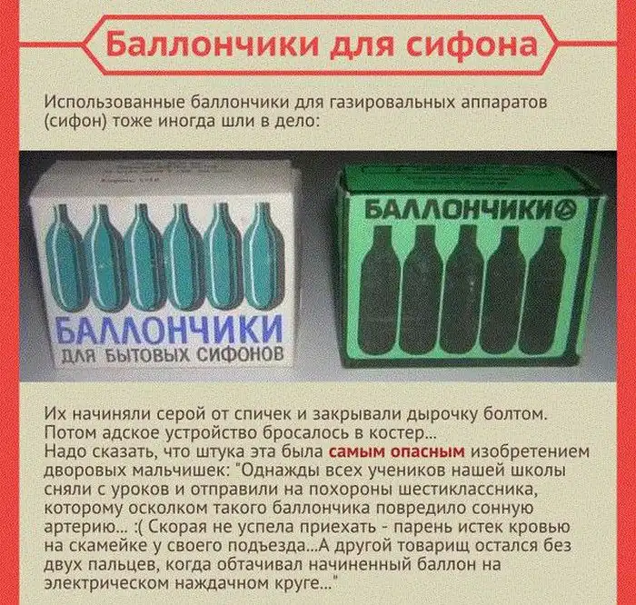 К болтам надо было скрученный в трубку кусок полиэтилены привязывать, в качестве стабилизатора падения. А ещё у нас был битум вместо жевательной резинки. А бросать как копьё лампы дневного света!!! А потом брать порошок из них (содержащий ртуть, кстати) и натирать им пятикопеечные монеты - они становились по цвету очень похожи на пятьдесят и часто проходили по новому номиналу в парках аттракционов и кафе мороженного. Плевательные трубки, стыренные с телевизионных антенн на крышах. И многое другое...