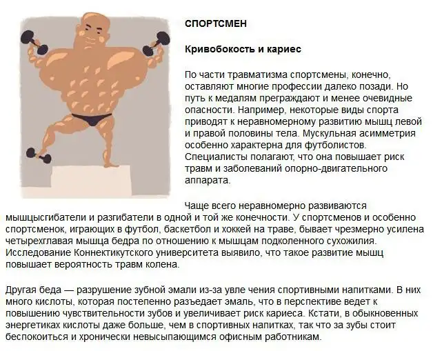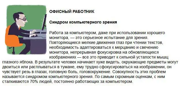 А я мебельщик, мне по душе формальдегид, опилки, и контактный клей. А еще даже во время игры в шахматы можно уснуть и наткнуться глазом на ферзя. Живыми с это света не выбраться. А еще работа не только на здоровье влияет но и на психику, это называется профессиональная трансформация психики.