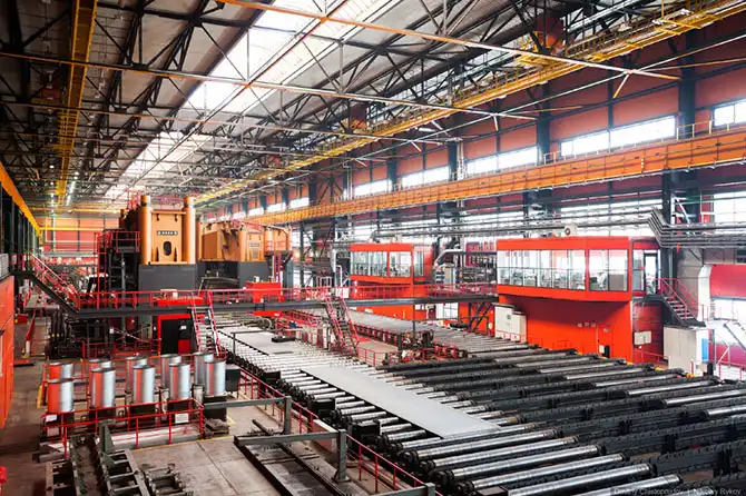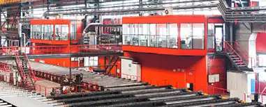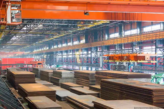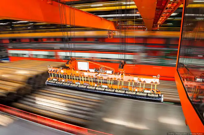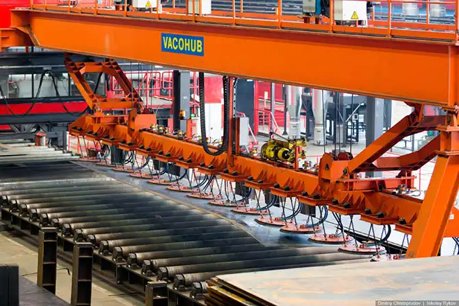 На производстве работают мостовые краны с магнитными присосками и вакуумными траверсами.