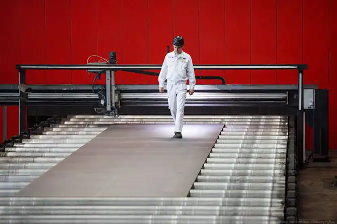 После резки и маркировки листы отправляются к могучим гигантам цеха — двум прессам шаговой формовки.
