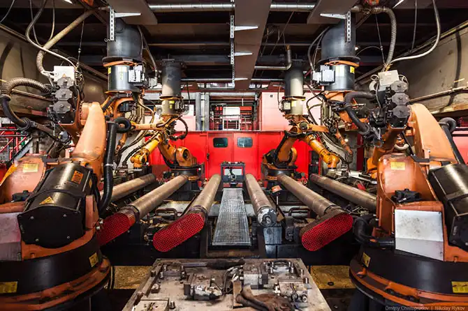 Дальше в работу вступают роботы-манипуляторы, которые приваривают технологические пластины к заготовке. Называется станция приварки технологических пластин.