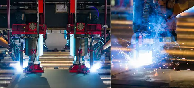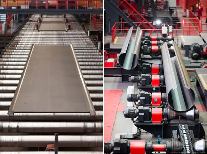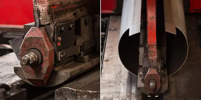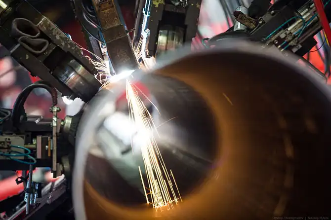 Огромные прессы размером с добрый коттедж гнут стальной лист толщиной 2 см в трубу примерно за одну минуту.