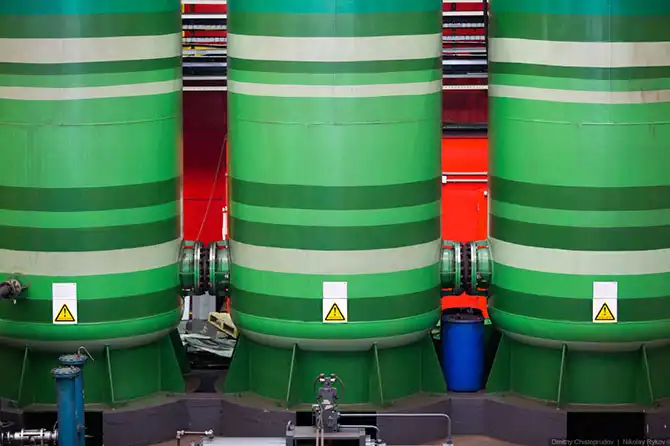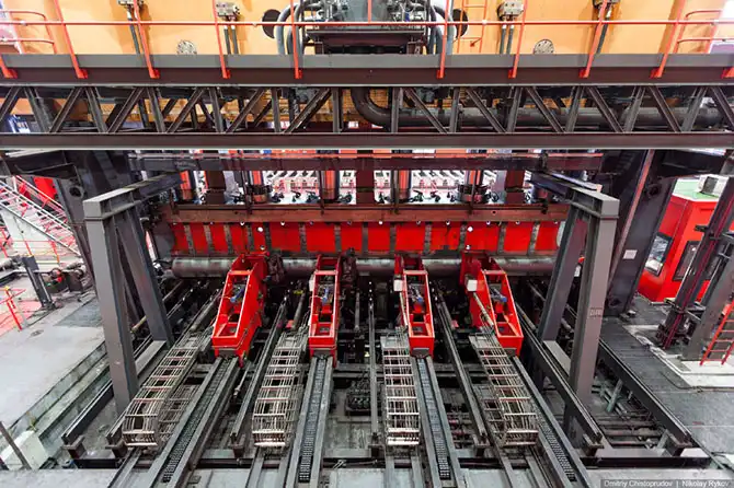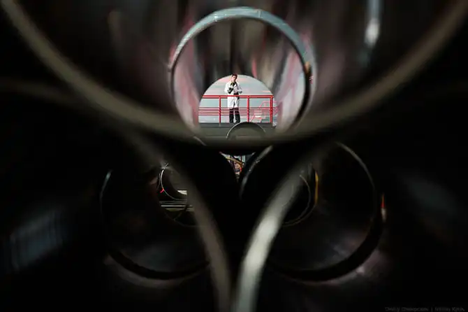 До поездки в Челябинск я уже не раз смотрел фотографии этого удивительного места, и пускай мой репортаж будет стотысячным, я не могу не поделиться впечатлениями от увиденного. Вместо традиционной, неприятной на ощупь спецухи, тяжелых огнеупорных ботинок, респиратора и очков при входе в цех выдают белые халаты и белые каски. Огнеупорные ботинки на таком производстве не требуются, и я пошел в своих уггах, не до конца просохших после утренней съемки, по отполированному паркетному полу смотреть, как создаются российские трубы…