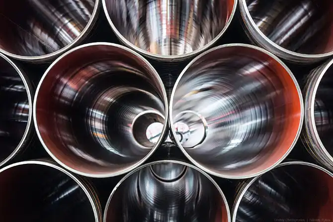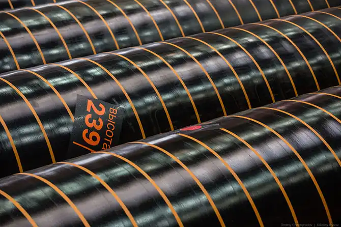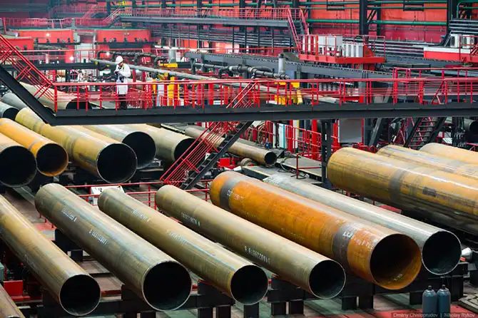 Мощности «Высоты 239» включают участки шаговой формовки, сварки, отделки внутреннего и наружного антикоррозионных покрытий. Начинается все со склада стальных листов — заготовок для будущих труб.