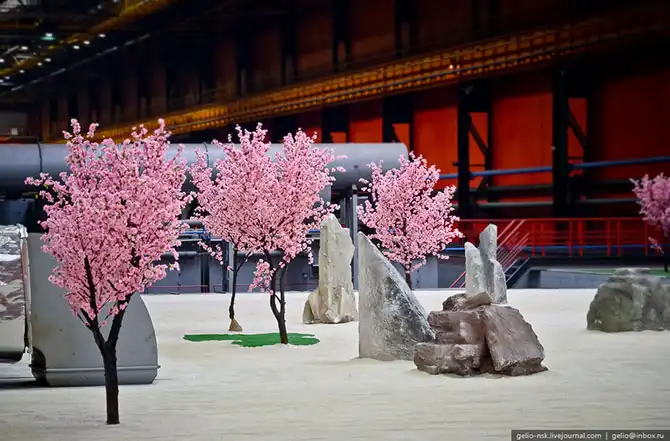 В цехе разбит сад камней — уникальный «уголок спокойствия». Подобного элемента декора нет ни на одном промышленном предприятии. Сад камней украсил крышу сушильного отделения, — это 30 тонн песка, 12 сакур и 33 камня. Сакуры не настоящие. Настоящие — пальмы на галерее.