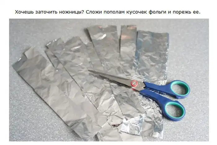 а чтобы заточить ножницы нужно резать не фольгу а мелкую наждачную бумагу