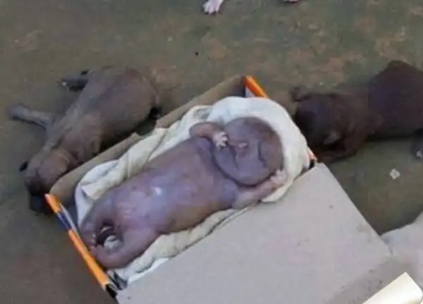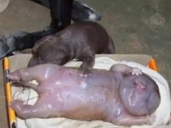 Новорожденный "Шариков" появился на свет мертвым, с оголенной кожей без признаков шерсти, а лапы его были расположены нетипичным для собак образом и напоминали скорее человеческие конечности.