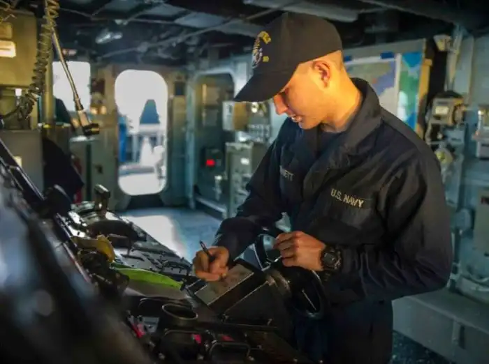 Матрос Виктор Бениш на боевом дежурстве во время прохода авианосца через Гибралтарский пролив. Родители парня иммигрировали в США с Украины.