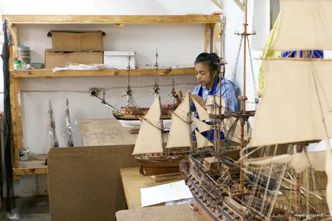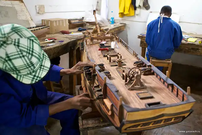 Остров Мадагаскар, славится не только лемурами и баобабами. На острове есть уникальная мастерская, где делают модели кораблей музейного качества, из розового и красного дерева.