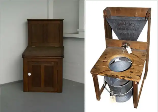 Туалетный стул, один из предков унитаза, очень походит на самый обычный стул. Разница лишь в том, что в сидении стула было специальное отверстие, а снизу крепился резервуар для сбора отходов.