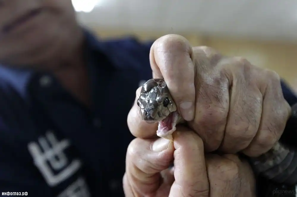Рабочий змеиной фермы демонстрирует эмбрион кобры. Тайнань, Тйвань, 5 февраля 2013 года. © REUTERS/Pichi Chuang