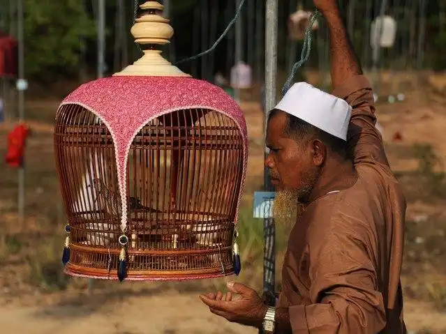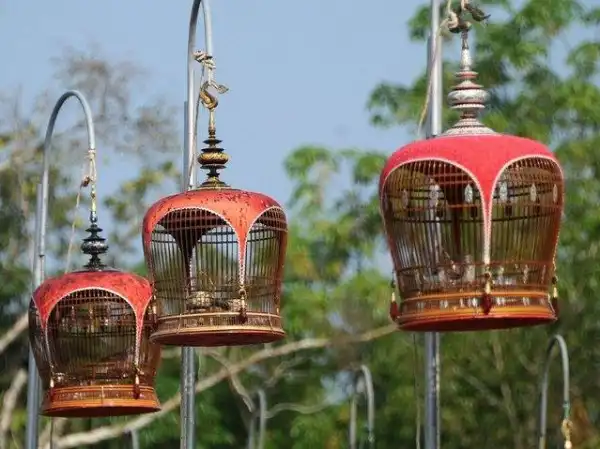 Птицы находятся в богатых бамбуковых клетках, драпированных разными красочными тканями, но когда начинается конкурс клетки поднимают на крюки, находящиеся на металлической сетке на высоте трех метров.