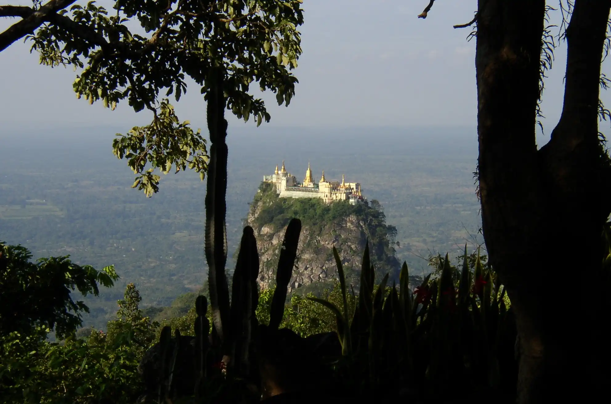 С такой высоты открываются прекраснейшие пейзажи. Перед вами вид древнего и таинственного города Паган. Отсюда можно также увидеть гору Таунг Ма-ги. Ее вид можно сравнить разве что с горой Фудзияма в Японии. Тут видно каньон глубиной 914 метров. В общем, трудный подъем по практически отвесной скале стоит вида вокруг. Кстати, тут нужно помнить не только о безопасности, но и следить за своими вещами. Потому что администрация монастыря не несет ответственности за всех макак, которые очень не против стащить что-нибудь у огромного количества туристов.