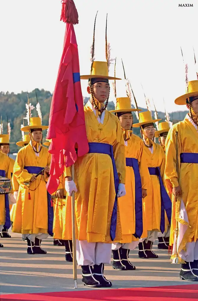 Гардероб королевской гвардии Южной Кореи так же похож на военную форму, как костюм белочки на рясу митрополита. Тем не менее эти мужественные и суровые воины принадлежат к элитным подразделениям и способны решать сложнейшие боевые задачи. Просто они не хотят выставлять это напоказ, поэтому традиционно одеваются в смешные желтые халаты, белые кальсоны и высокие шляпы.