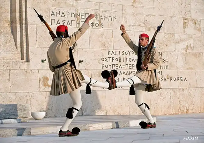 Это странно, но нередко в самую смешную форму наряжают солдат почетного караула, которые охраняют вполне серьезные и даже святые места. Вот так выглядят греческие эвзоны, марширующие у могилы Неизвестного солдата в Афинах. Смеяться над памятью павших могут только очень циничные люди. Но не всем туристам удается не рассмеяться при виде этих парней в совершенно клоунских одеяниях и смешными движениями.