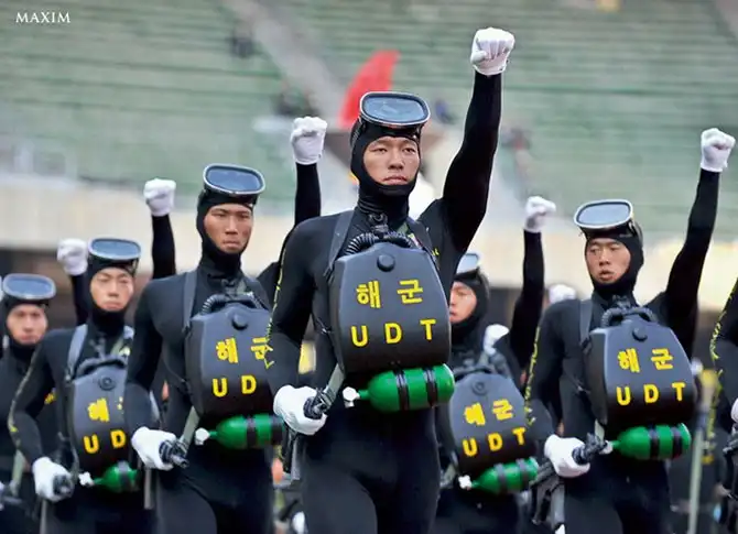 Чтобы вы не считали, что армия Южной Кореи — это грустные люди в желтых халатах, мы решили показать еще и боевых пловцов. В честь парада они не прячут лица под маской и даже вынули изо рта трубки. Сложнее всего не наступать друг другу на ласты.