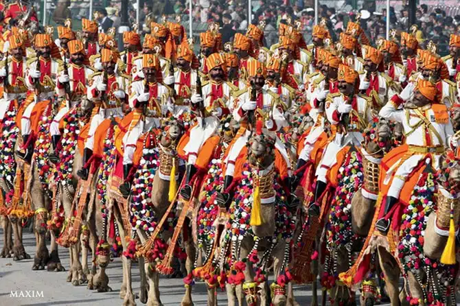 А это индийские пограничники гарцуют на своих нарядных верблюдах в центре Дели по случаю Дня республики. Конечно, никто никогда не узнает в них пограничников, в том числе и нарушители индийской границы. Они решат, что приехал цирк, и смело пойдут нарушать границу. Вот тут-то их и поймают. Ура!